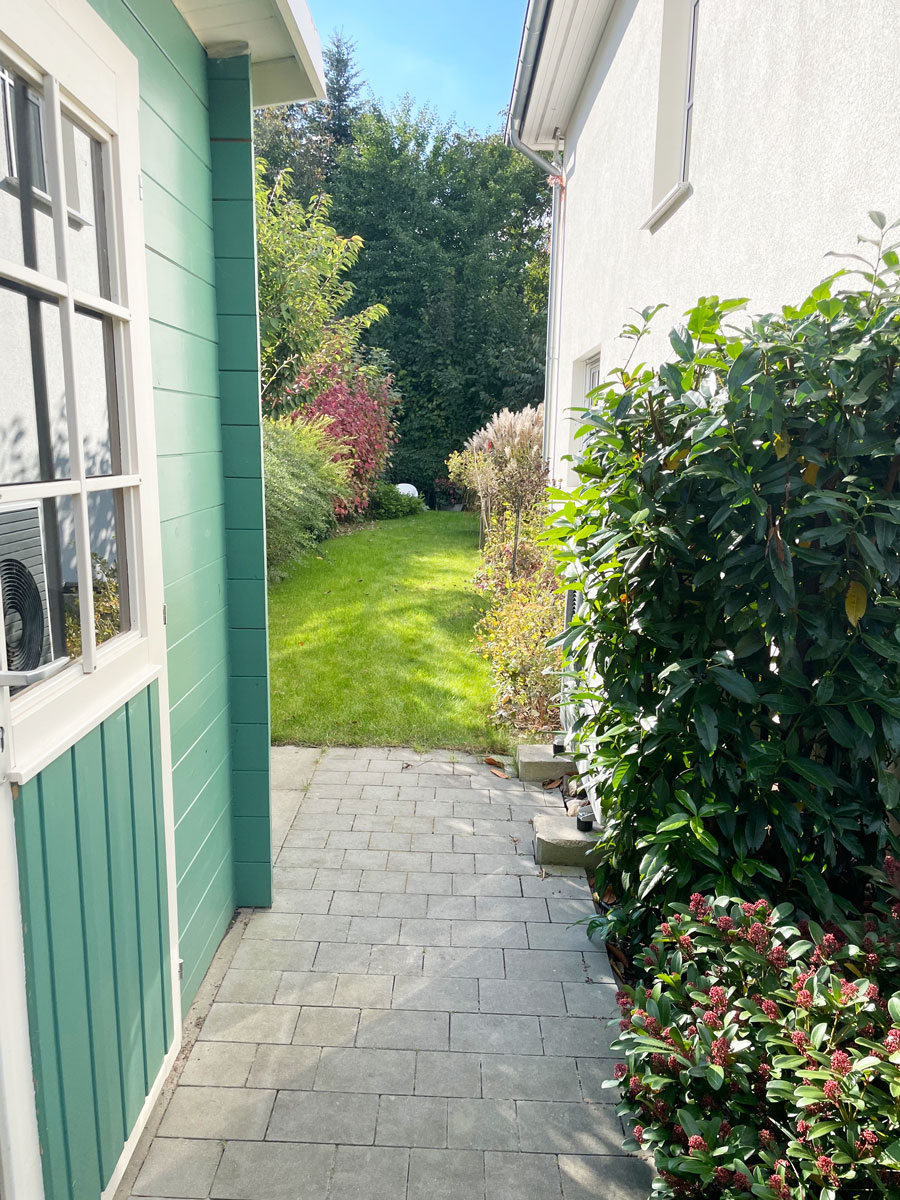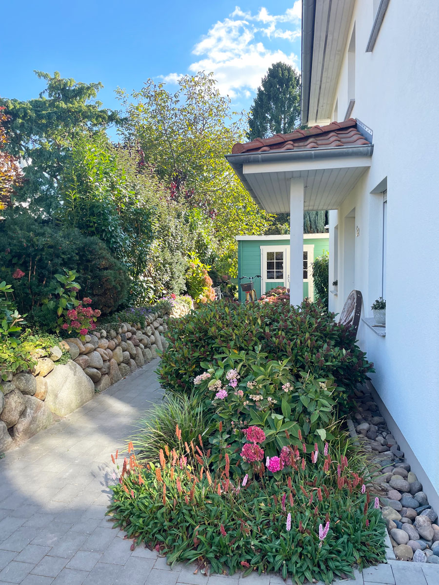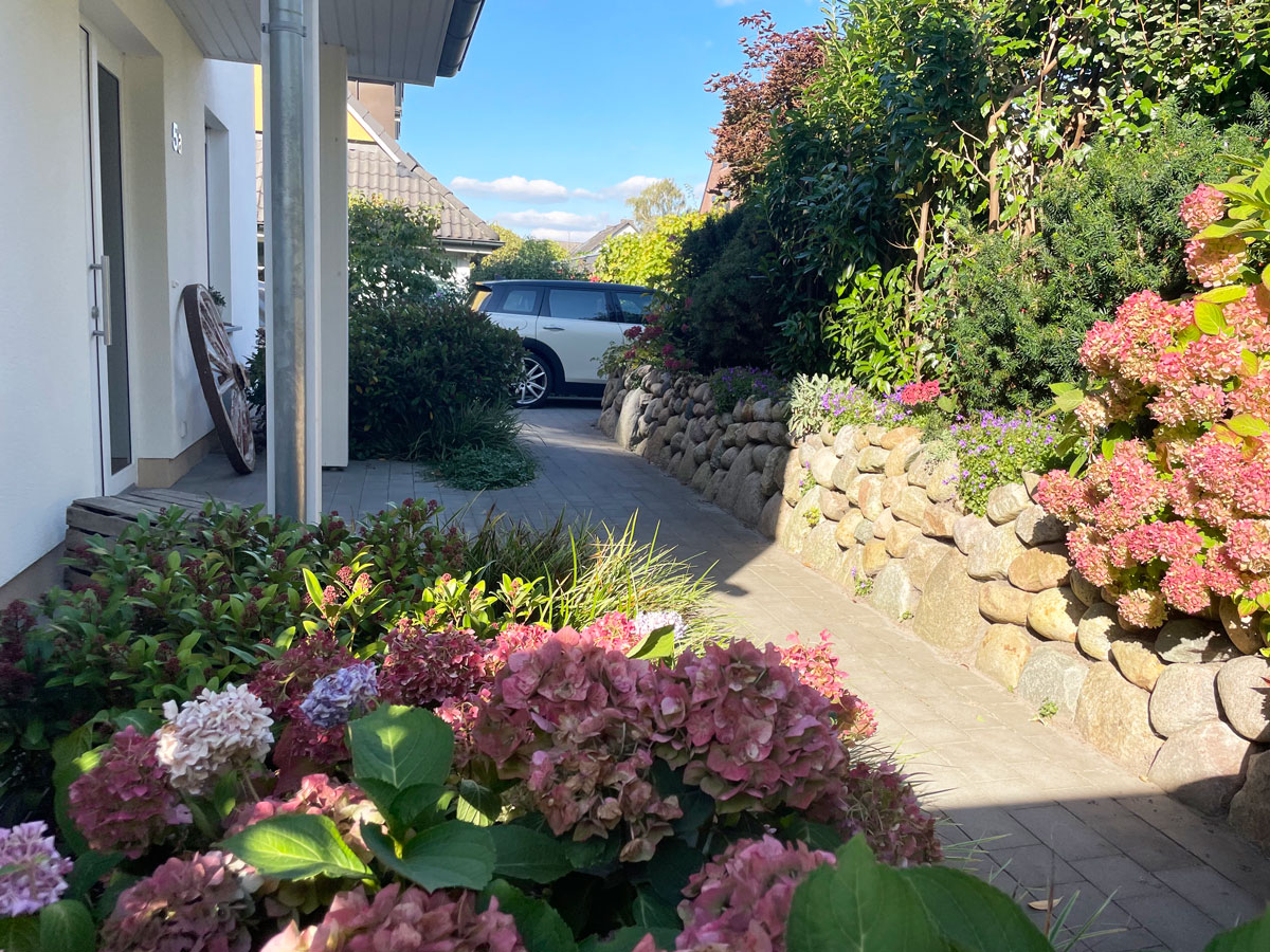 Der Eingangsbereich wird mit einer üppig bepflanzten Friesenwall von dem Nachbargrundstück begrenzt.