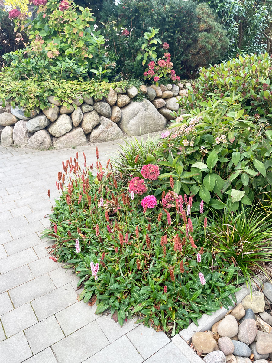 Nach den Kirschbäumen kommen die Weigelien, Rhododendren und Schneebälle. Im Sommer blühen Deutzie, Hartriegel, Spieren und vielen Stauden. Im späteren Sommer fängt die Blüte von Hortensien, Strauch-Efeu und Chinaschilf. Eine Unterbepflanzung von Bodendeckern und Stauden, wie Katzenminze, Lavendel, Storchschnabel und Kräutern, sowie immergrünen Gräser wie Japansegge und Immergrün schaffen weitere Vielfalt zur Bepflanzung.