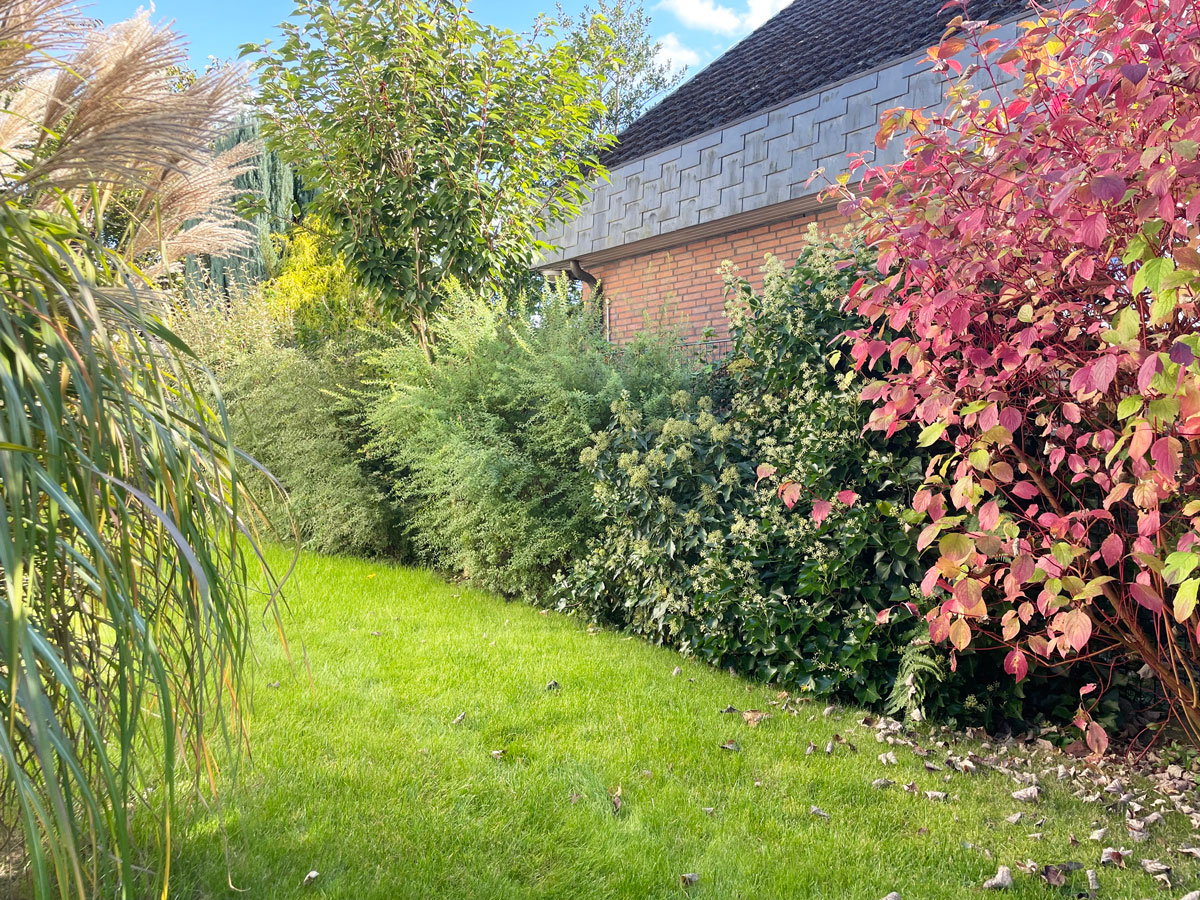 Der Eingangsbereich wird mit einer üppig bepflanzten Friesenwall von dem Nachbargrundstück begrenzt.