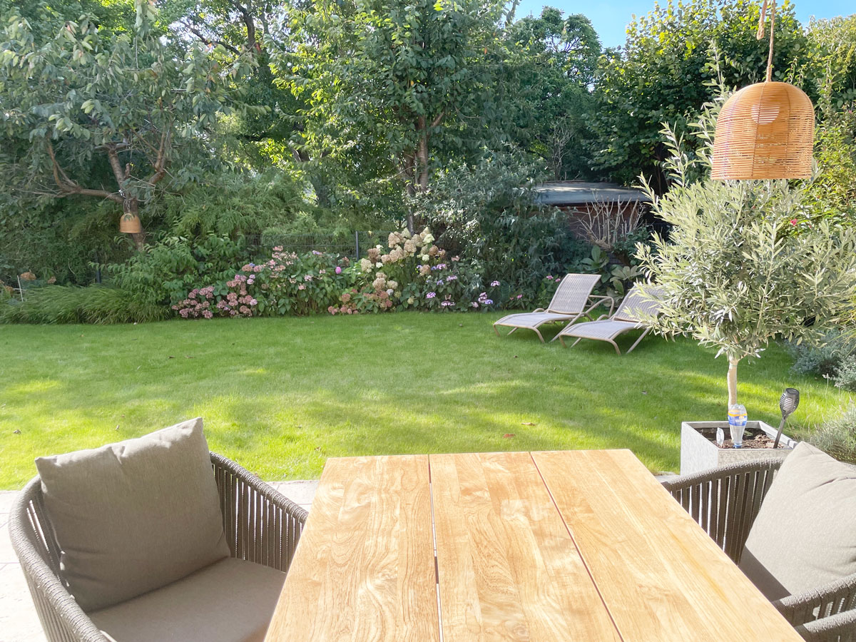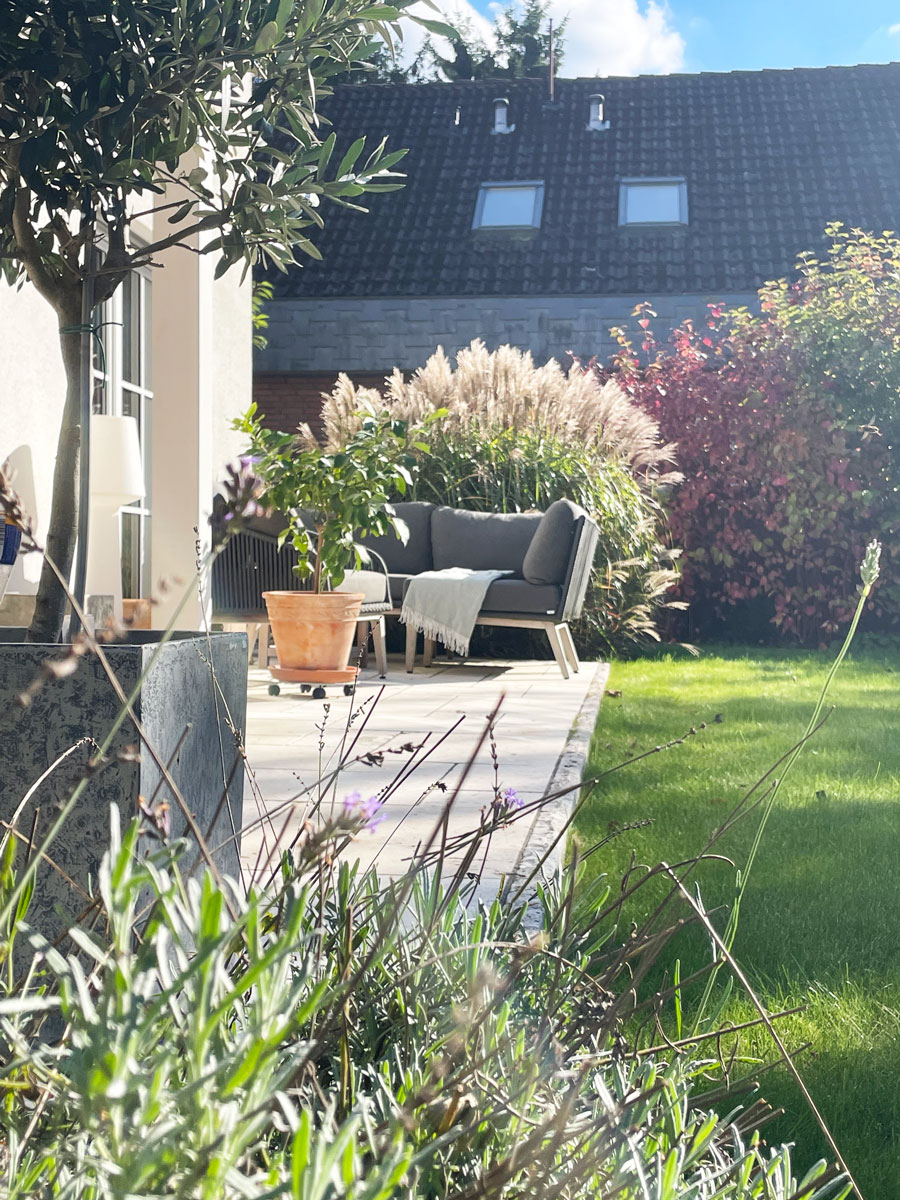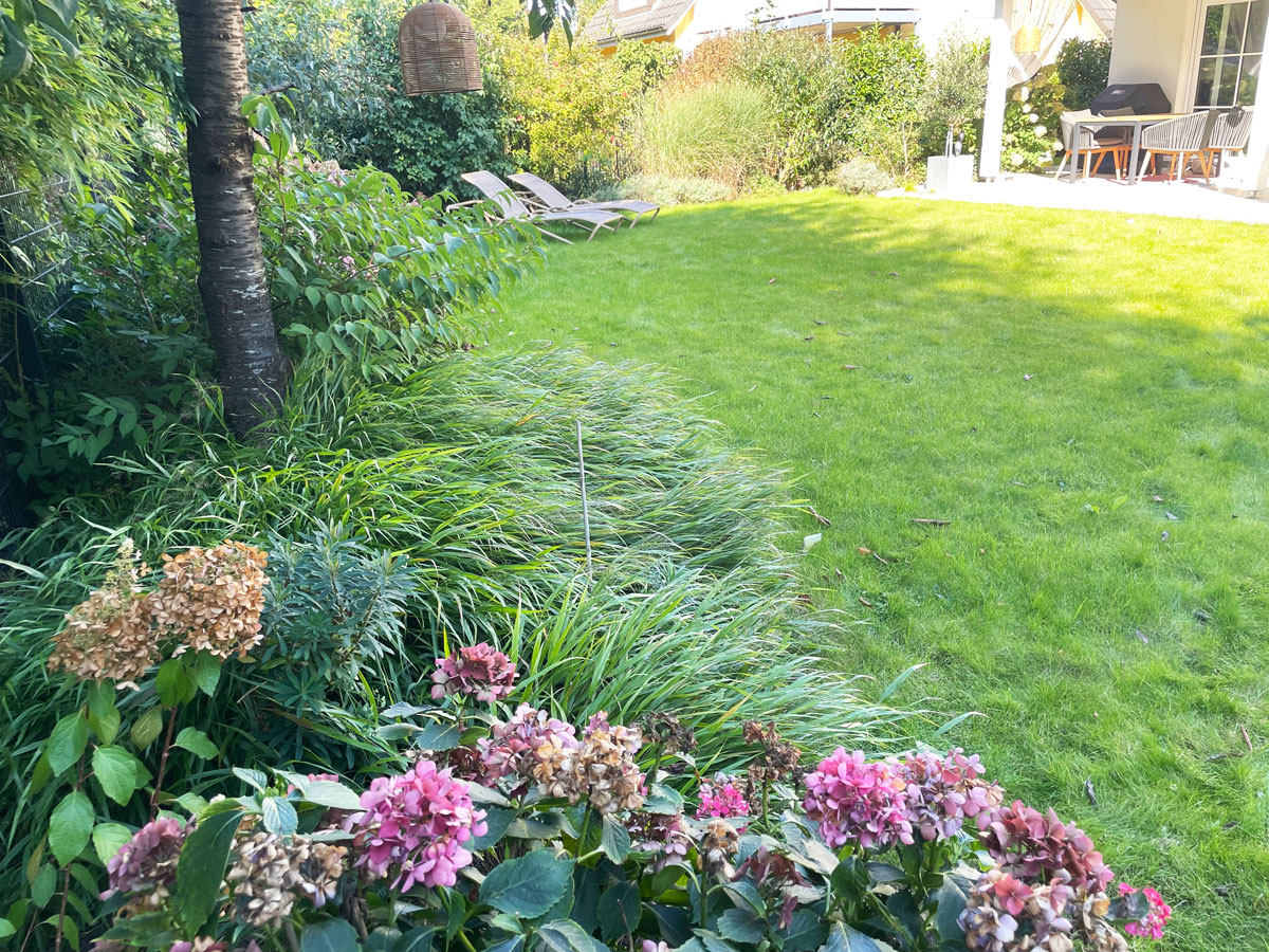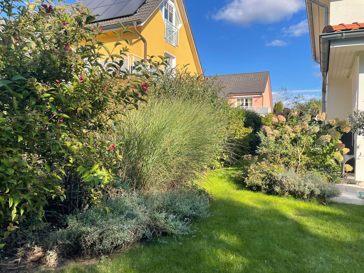 Die wichtigste Aufgabe für die Gartenplanung war ein stimmiges Bepflanzungskonzept, welches Sichtschutz und jahreszeitliche Abwechslung bietet und die Terrasse und dem Rasen in der Mitte des Gartens in eine grüne Oase verwandelt.